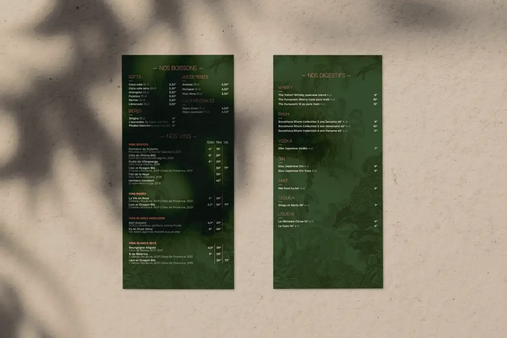 Enfin, après avoir consolidé le concept, nous avons présenté au restaurant Koh Samui des propositions initiales des cartes. Ces maquettes ont été élaborées avec soin pour répondre aux objectifs visuels établis au préalable, créant ainsi une expérience visuelle immersive pour les clients. Nous avons pris en compte la clarté, la lisibilité et l’attrait esthétique pour garantir une navigation fluide à travers les menus.